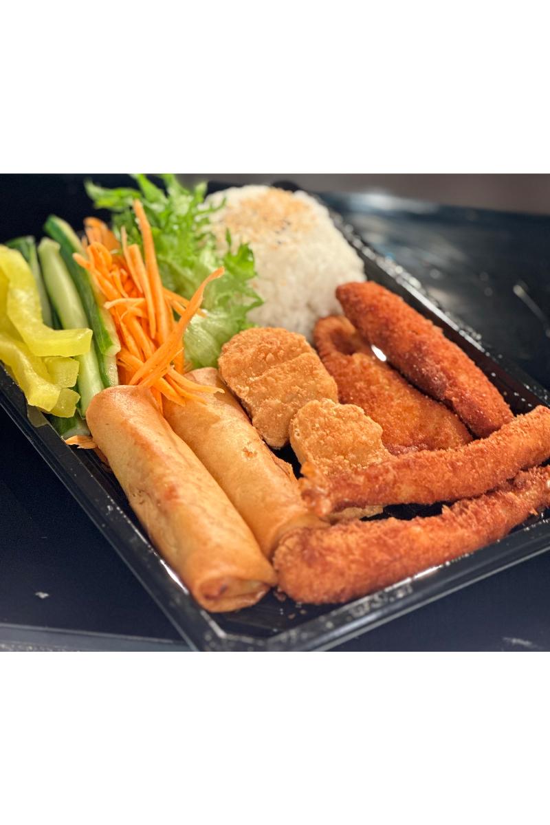 Med vårruller, kongereker, kylling salat, ris & sweet chili dip
