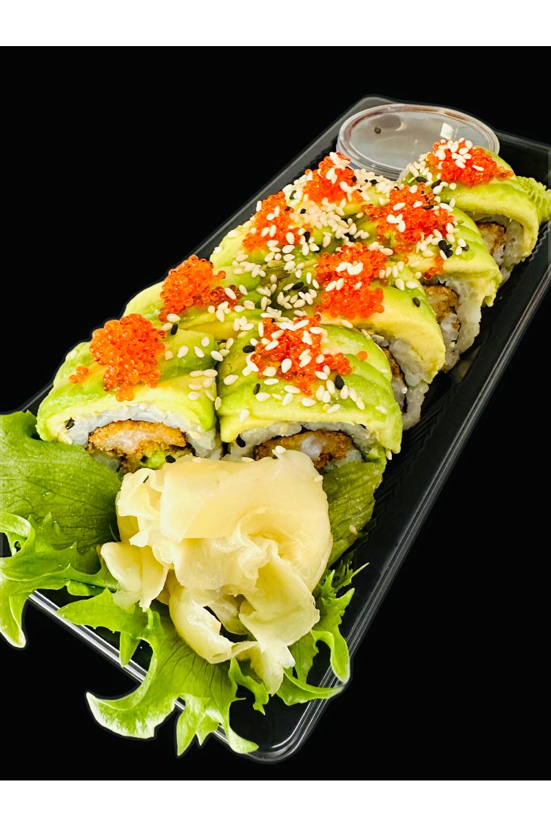 Ris rull m/fritert scampi inni. Avokado og rogn på toppen