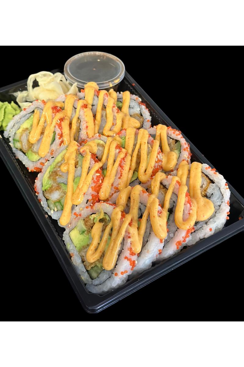 12 biter store maki m/fritert tempura scampi, tobiko og chilimajones