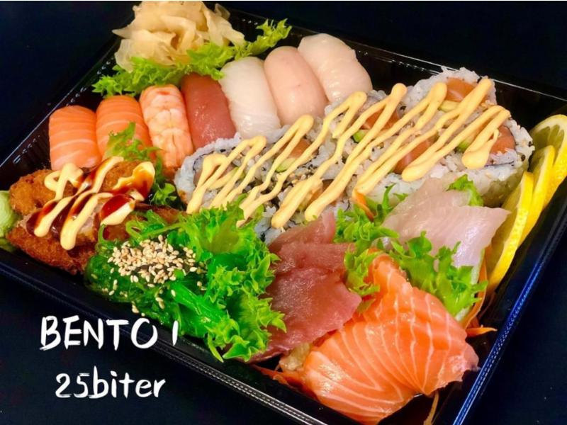 6 nigiri, 8 spicy laks maki, 9 sashimi, 2 innbakt scampi og wakame