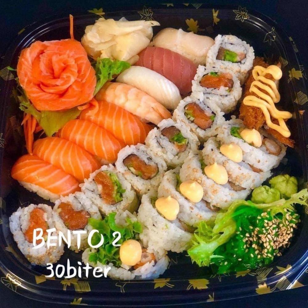 6 laks sashimi, 8 nigiri, 6 futo tempura maki, 8 ura laks maki, 2 biter tempura scampi m/chilimajones og wakame